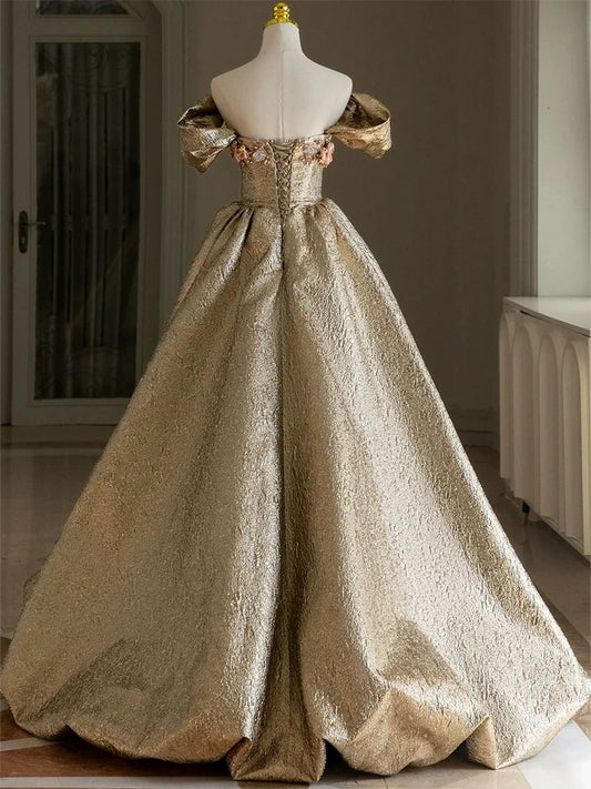 Pretty Ball Gown Off The Shoulder Gold Satin Long Ruffles Prom Dresses Sweet 16 Dresses C3591