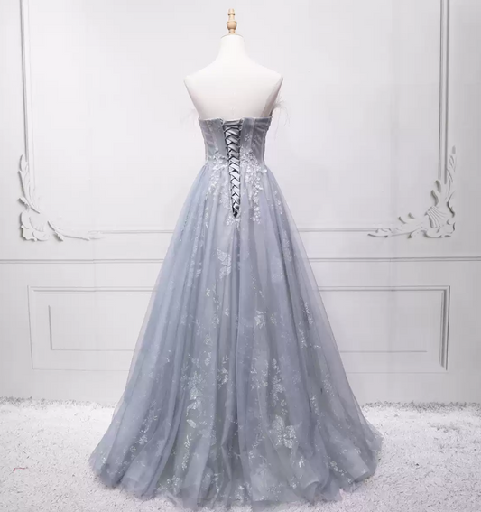 Luxury Strapless Feather Grey Ball Gown Beading Tulle Sweet 16 Dresses C8327