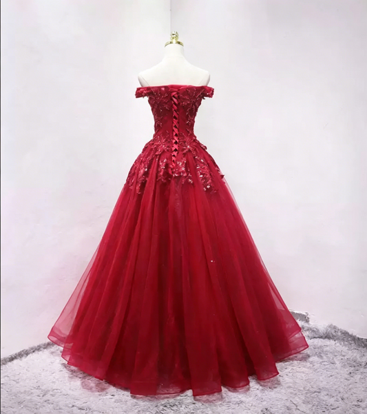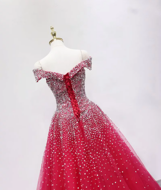 Luxurious Red Off-the-Shoulder Ball Gown Beaded Tulle Sweet 16 Dresses C8335