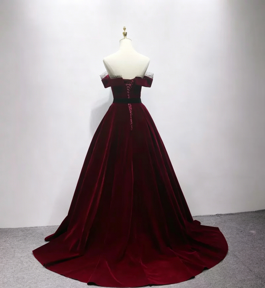 Retro Off-the-Shoulder Burgungy Ball Gown Velvet Lace Sweet 16 Dresses C8332
