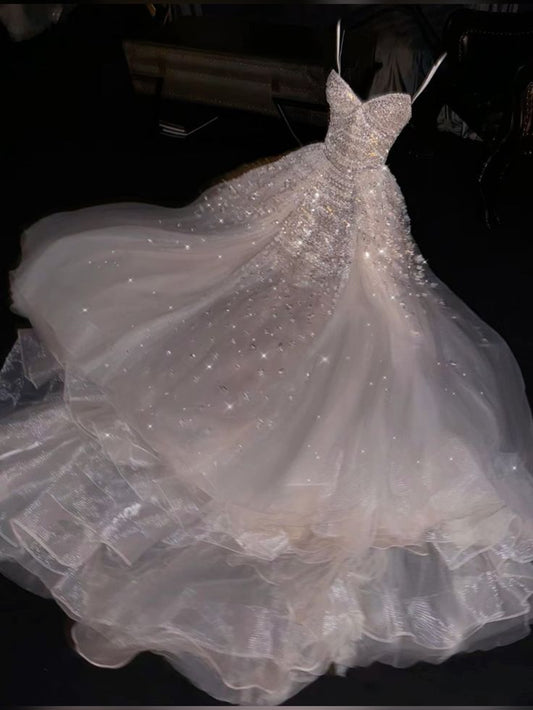 Princess Ball Gown Spaghetti Straps Tulle Sequin Long Prom Dress,Formal Dress C5866