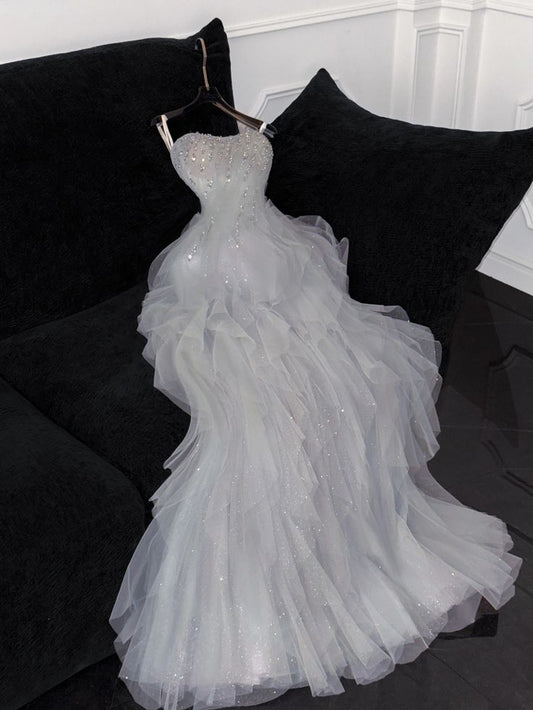 Sparkly Mermaid Spaghetti Straps Tulle Pleated Sequin Long Prom Dress,Formal Dress C5849