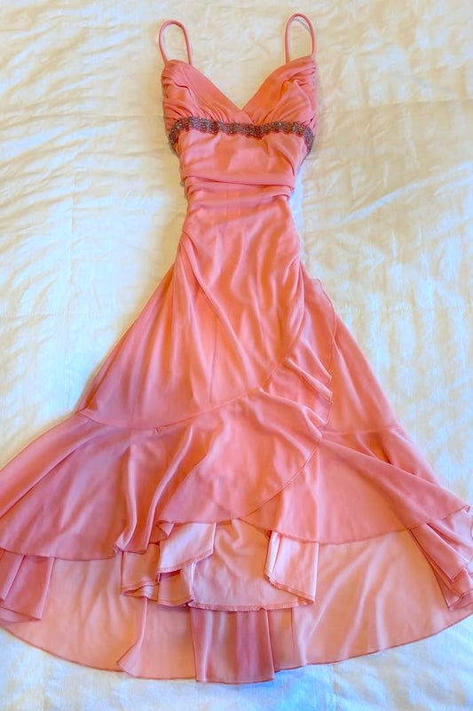 Gorgeous A Line Spaghetti Straps Satin Chiffon Ruffle Beads Long Prom Dresses Formal Dress C5757