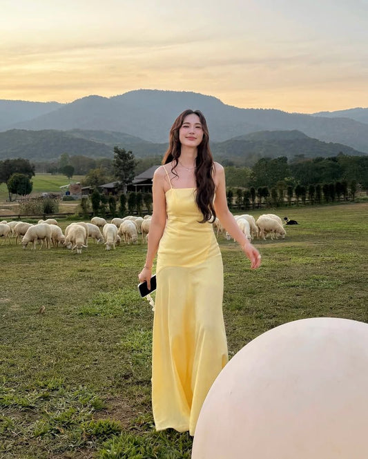 Gentle Mermaid Pastel Yellow Spaghetti Straps Satin Long Prom Dresses Formal Dress C5210