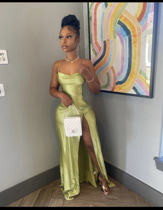 Square A Line Green Satin Slit Long Prom Dresses Formal Dress C5167