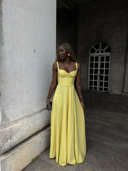 Yellow A Line Spaghetti Straps Satin Long Prom Dresses Formal Dress C5015
