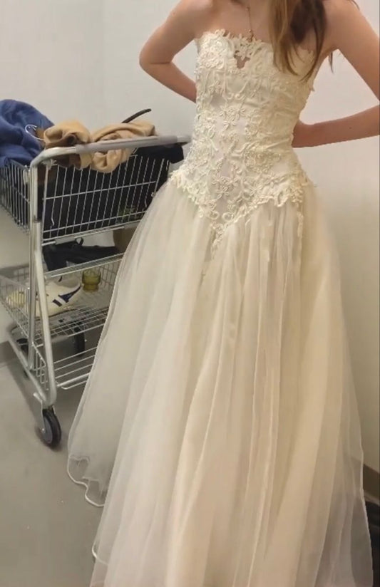 Pretty A Line Strapless Tulle Lace Long Prom Dresses Formal Dress C5088