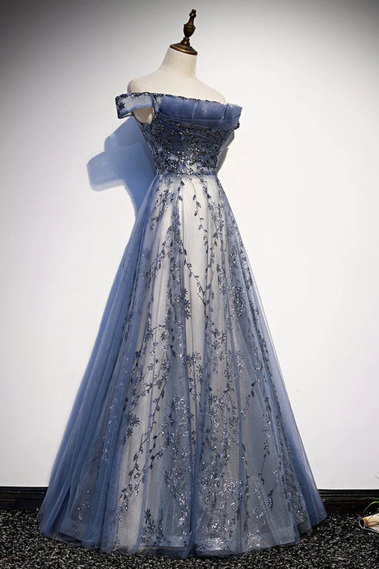 Charming A Line Off The Shoulder Blue Sequin Long Prom Dress B543