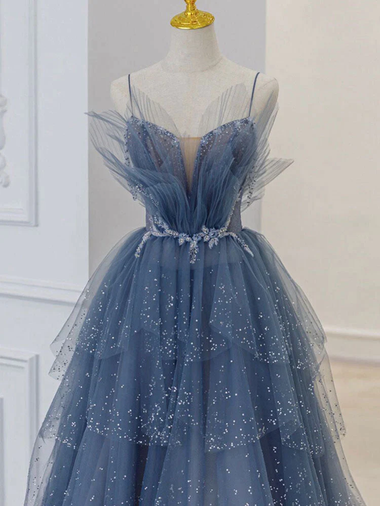 Beautiful Blue Layers Tulle Long Prom Dresses B638