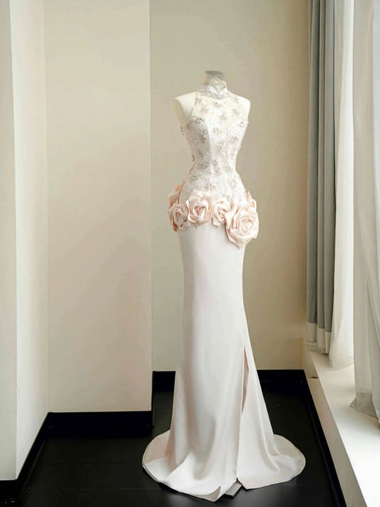 Obessed A Line Halter Satin Lace Long Prom Dress,Formal Dress C5990