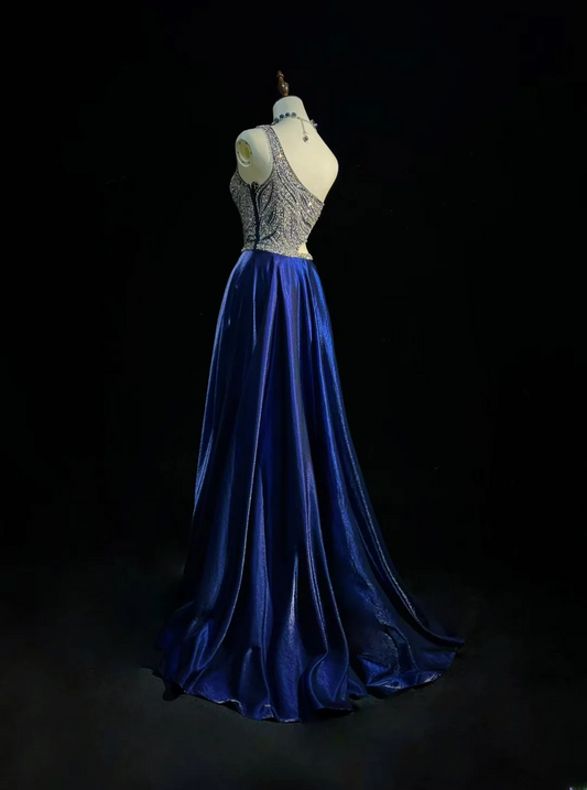 Obsessed A Line One Shoulder Satin Beaded Without Sleeves Long Prom Dress, Evening Dress C6538