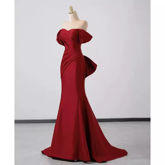 Sexy Mermaid Off The Shoulder Satin Burgundy Long Prom Dresses With Bowknot C846
