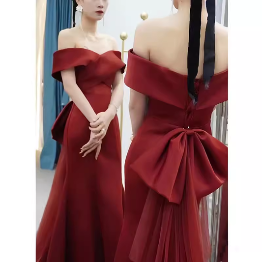 Sexy Mermaid Off The Shoulder Satin Burgundy Long Prom Dresses With Bowknot C851