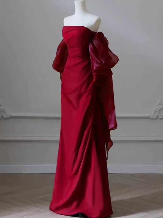Sexy Mermaid Off The Shoulder Short Sleeves Satin Burgundy Prom Dress C856
