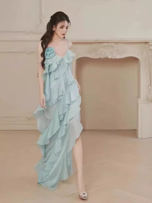 Simple A Line Spaghetti Straps Sleeveless Slit Chiffon Prom Dress C970