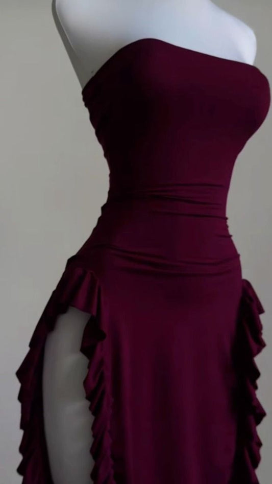 Sexy Sheath Strapless Burgundy Slit Prom Dresses Homecoming Dress C726