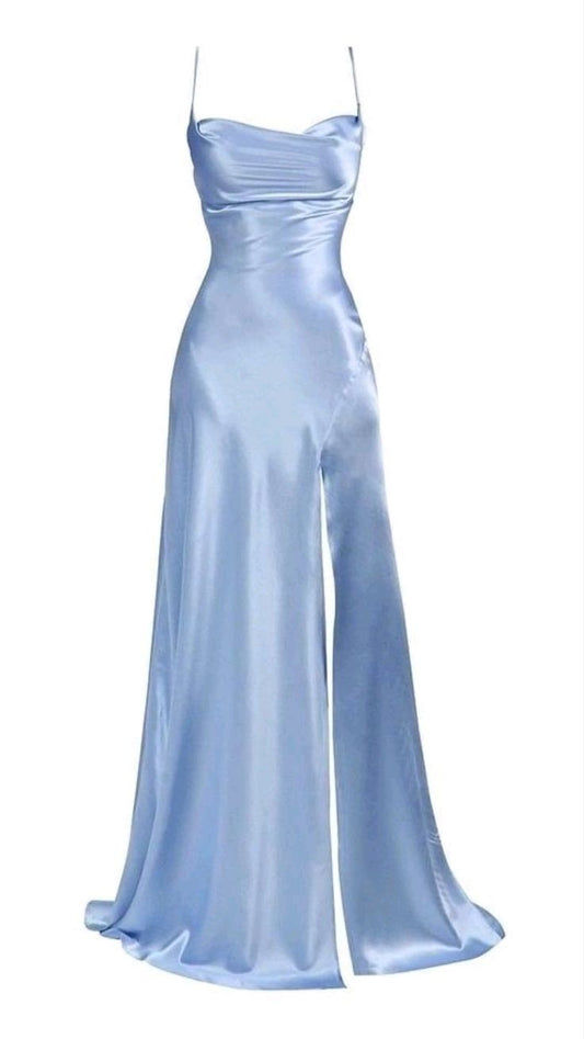 Vintage A Line Spaghetti Straps Silk Satin Slit Long Prom Dress C727
