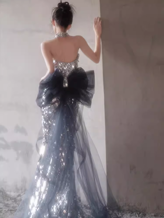 Sparkly Blue Prom Dresses With Bow Sequins Off The Shoulder Formal Party Dress C300