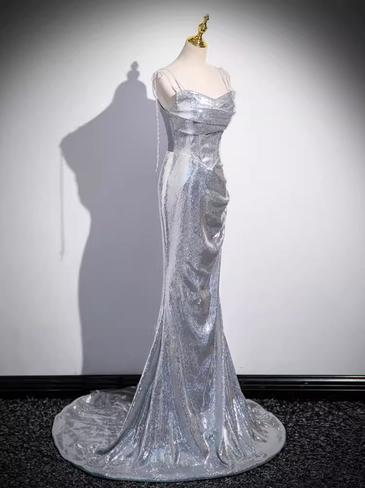 Mermaid Straps Silver Sequin Long Prom Dress B174