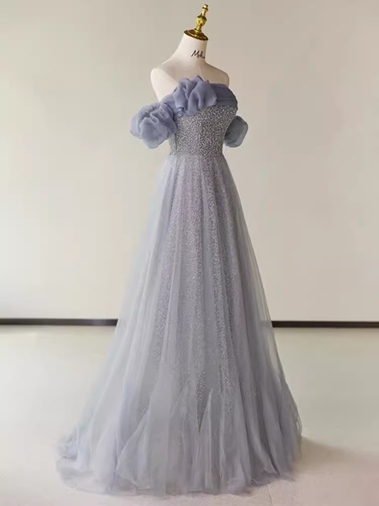 Simple A line Strapless Short Sleeves Tulle Long Prom Dress B194