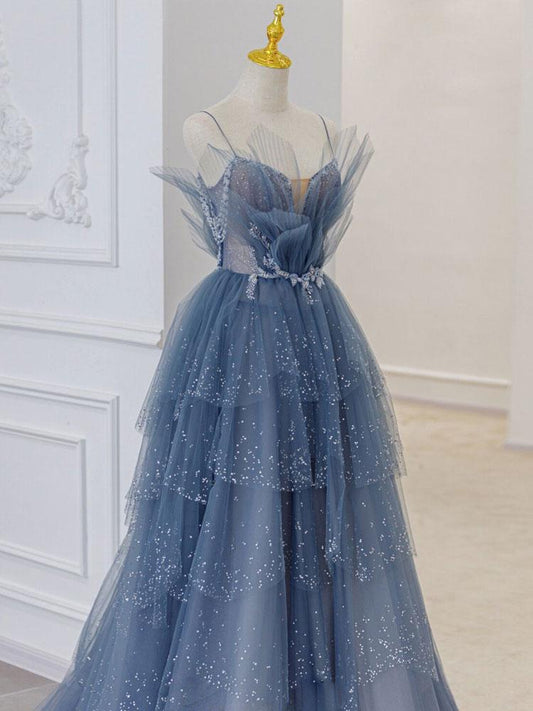 Elegant Ball Gown Straps Long Tulle Blue Prom Dress B492