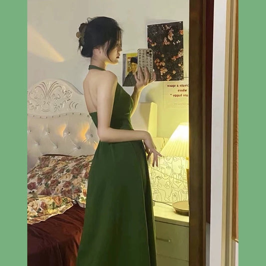 Elegant A line Halter Satin Green Sleeveless Prom Dresses birthday Party Dress C3648
