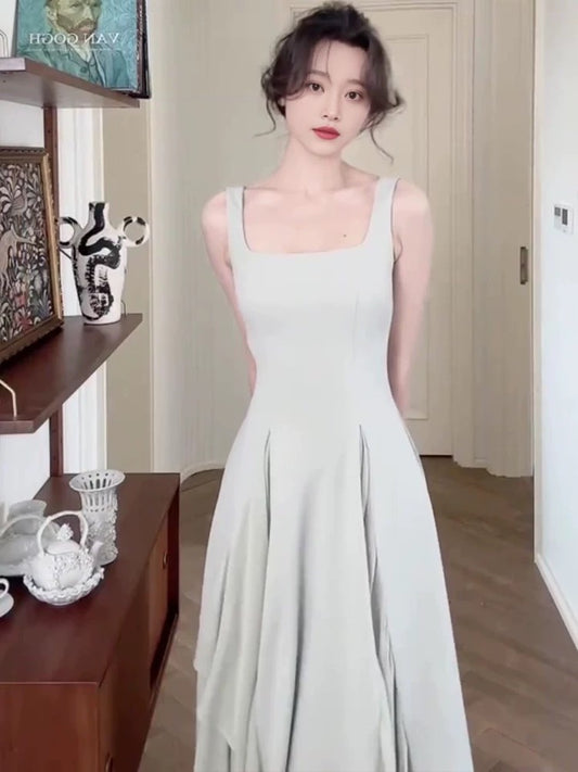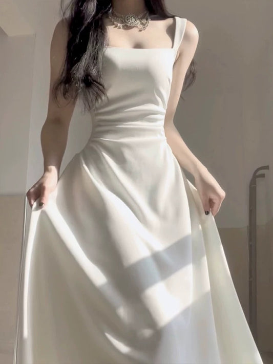 Vintage Mermaid Square Neckline White Sleeveless Satin Prom Dresses Birthday Party Dress C3656