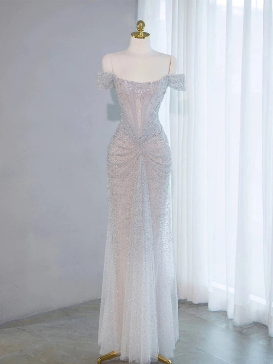 Pretty Mermaid Off The Shoulder Sequin Long Evening Dress Prom Dresses With Beads C3449