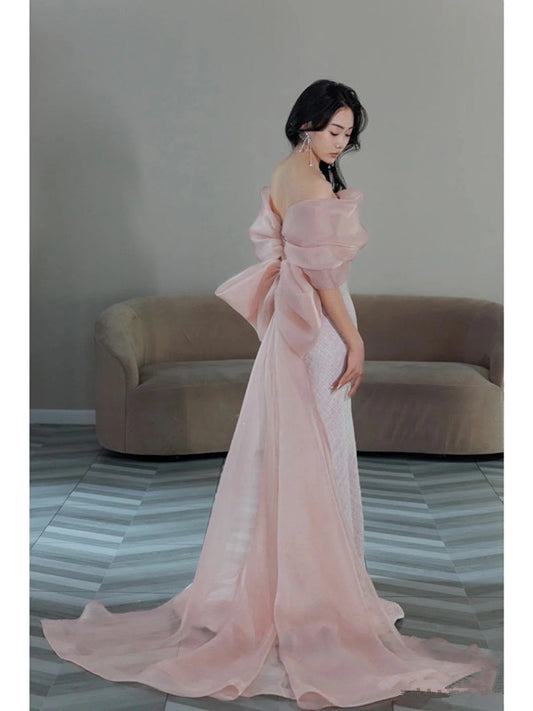 Pretty Mermaid Off The Shoulder Sequin Pink Long Evening Dress Prom Dresses With Bow C3445