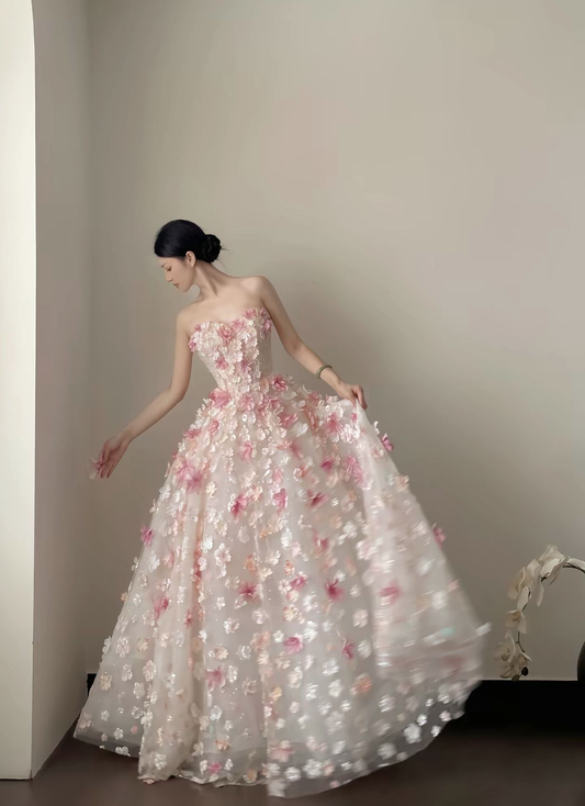 Fairy A Line Strapless Tulle Applique Long Prom Dress, Evening Dress C6257