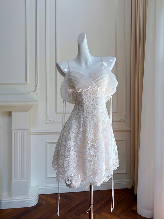 Modest A line Spaghetti Straps White Lace Short Homecoming Dresses Birthday Outfit C2255