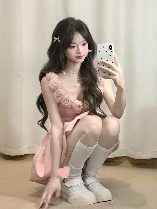 Pink A Line Spaghetti Straps Satin Flowers Short Homecoming Dress 18th Birthday Outfits C4461