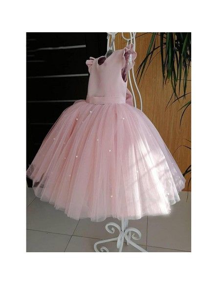 Pink Ball Gown Satin Tulle Ruffle Sleeves Back With Bow Knot Flower Girl Dress C6057