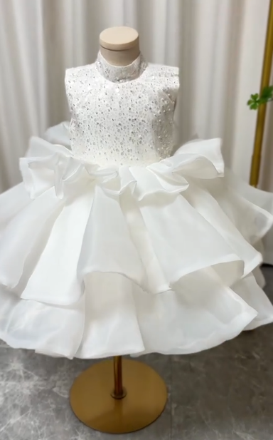 Pretty Ball Gown High Neck Satin Sequin Flower Girl Dress C6052