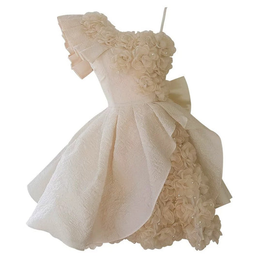 Pretty Ball Gown Straps Champagne Satin Flowers Homecoming Dresses Birthday Outfits With Bow C2239