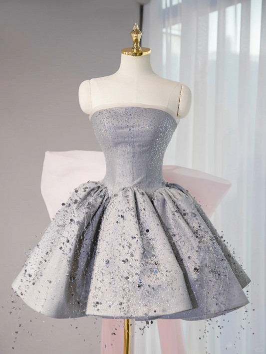 Pretty Gray Ball Gown Strapless Satin Sequin Back With Bow Short Homecoming Dress 16th Birthday Outfits C4450