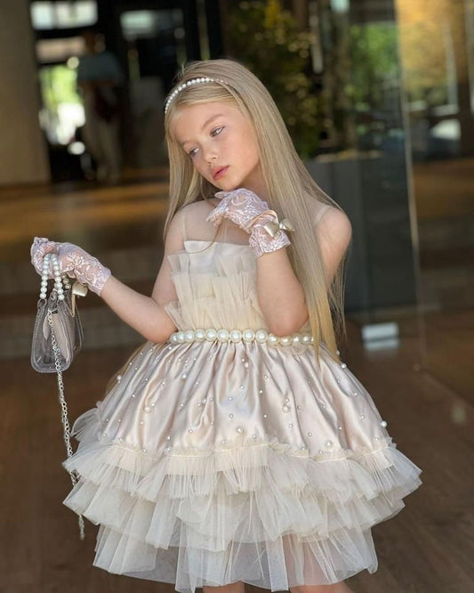 Princess Ball Gown Pearl Neck Satin Tulle Back With Bow Knot Flower Girl Dress C6056