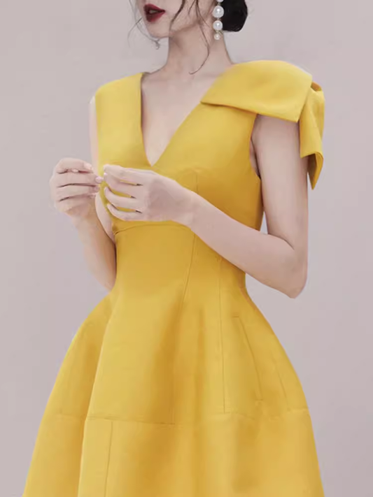 Sexy A line V Neckline Yellow Satin Birthday Outfit Homecoming Dresses C959