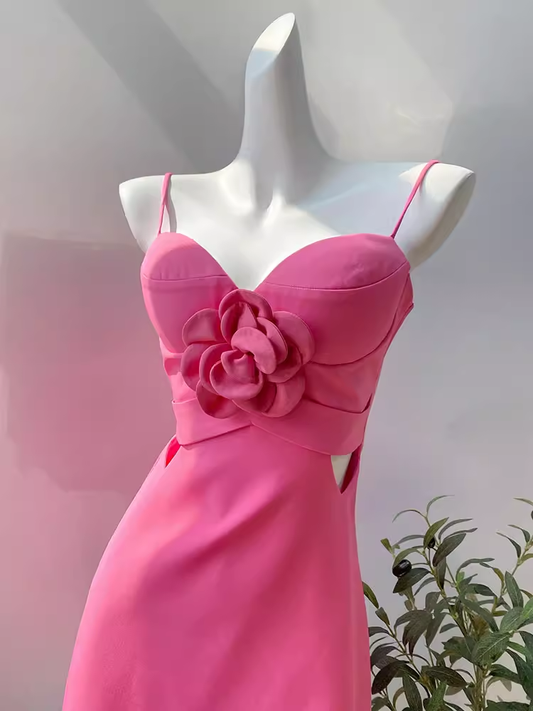 Elegant A Line Straps Neckline Pink Floral Satin Prom Dress Evening Dresses C2189