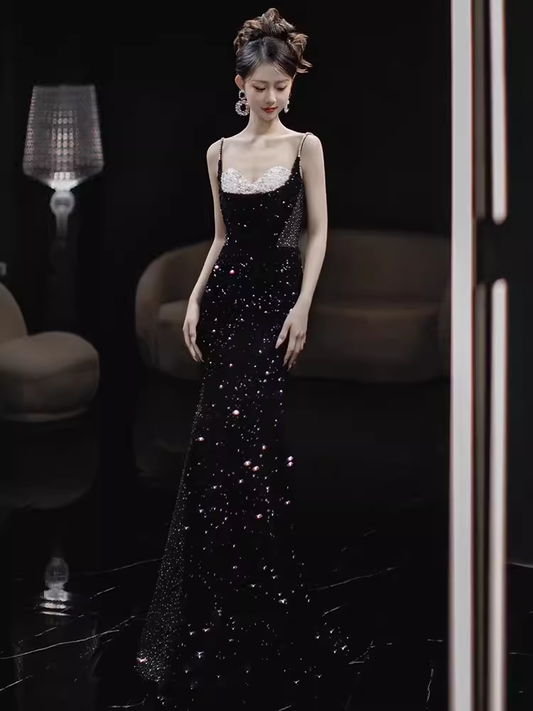Sexy Mermaid Straps Sequin Black Prom Dresses C50
