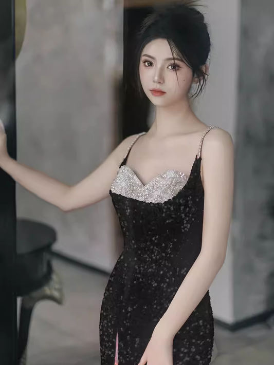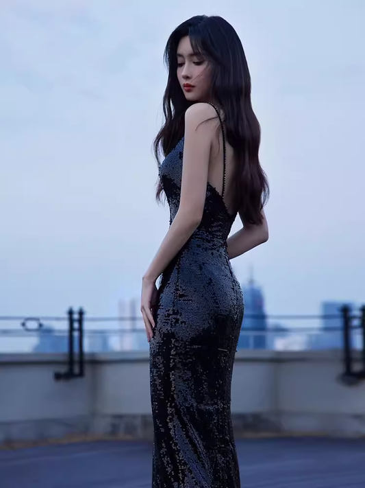 Sexy Sheath Spagehtti Straps Slim Fit Sequin Black Prom Dress Long Evening Dresses C2072