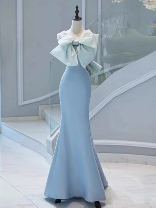 Pretty Sheath Strapless Blue Satin Long Prom Dress Evening Dresses With Bow C3252