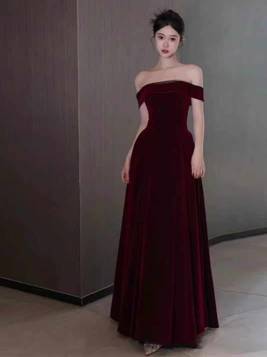 Elegant A line Off The Shoulder Burgundy Velvet Long Prom Dress Evening Dresses C3258