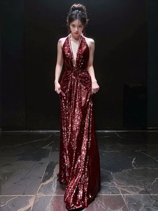 Sexy Mermaid V Neckline Burgundy Sequin Prom Dresses Evening Dress With Beads C3264