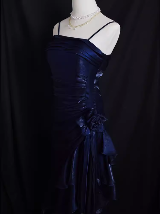 Vintage High Low Straps Ruffles Long Blue Prom Dresses C65
