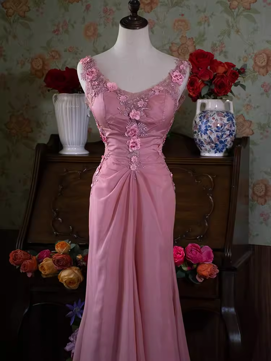 Vintage Mermaid V neckline Sleeveless Pink Long Prom Dresses C86