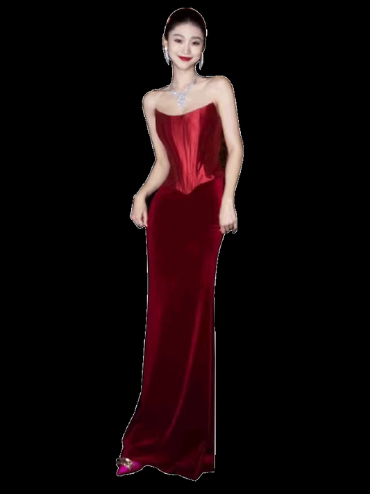 Vintage Mermaid Halter Sleeveless Velvet Burgundy Long Prom Dresses C81