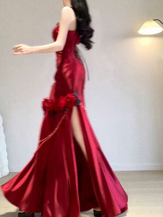 Vintage Mermaid Spaghetti Straps Burgundy Satin Long Floor Length Prom Dresses C3610