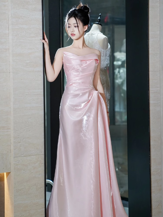 Modest Mermaid Strapless Shiny Satin Pink Long Prom Dresses C221