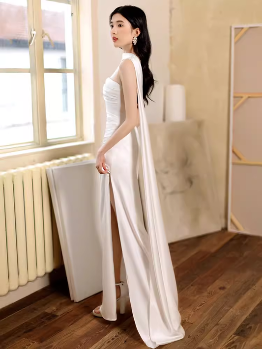 Sexy Sheath Strapless White Long Prom Dresses Satin Slit Birthday Outfits C233